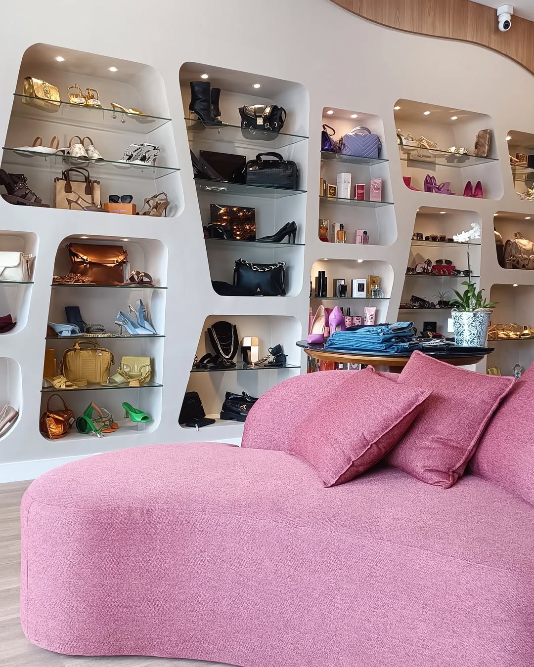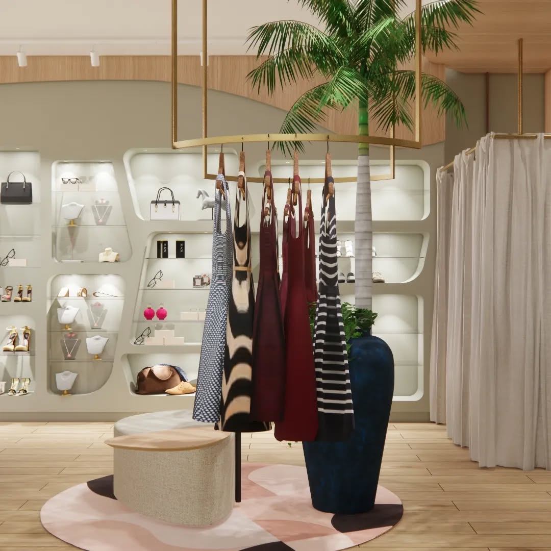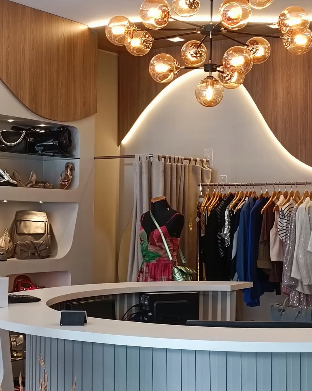 O projeto da loja Renan BY Rarus foi concebido para ser uma verdadeira experiência de compra, transportando os clientes para um universo de luxo, fluidez e design. O conceito principal foi criar um ambiente que equilibra a elegância feminina e as formas orgânicas com um toque de ousadia industrial. A fachada, revestida em metal corten perfurado, apresenta um contraste impactante com o interior, que se revela como um espaço acolhedor e sofisticado. Cada elemento foi cuidadosamente pensado para destacar as peças de grife, transformando a loja em uma galeria de moda e arte.