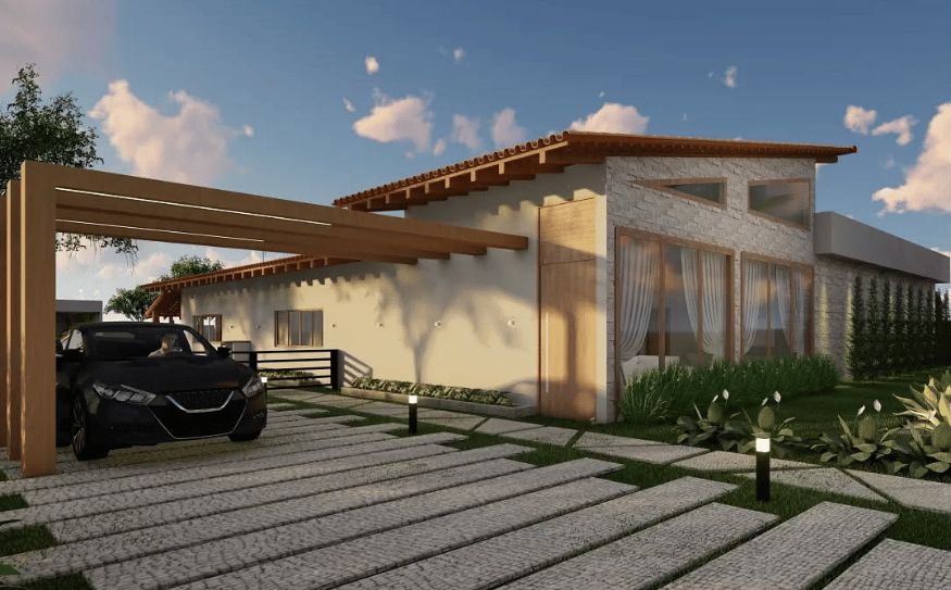 Esse projeto transmite uma pegada moderna, acolhedora e sofisticada, com destaque para: Cozinha integrada com ilha central, armários planejados e iluminação pontual. Área gourmet voltada para receber amigos e família, com muito aconchego. Espaço externo com paisagismo bem trabalhado, móveis fixos e soluções de design para conforto e convivência. Detalhes naturais e elegantes, como revestimentos, tons de madeira e integração do verde.