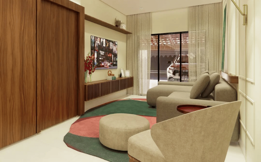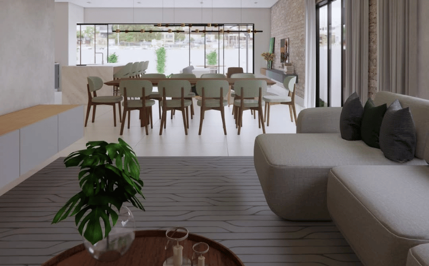 🔹 Sala de Estar – Amplitude, pé-direito alto e iluminação natural valorizam o mobiliário em tons neutros, criando um espaço acolhedor e sofisticado para receber.