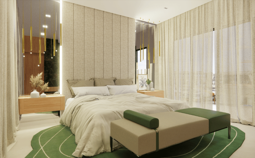 🔹 Banheiro/Suíte – Um verdadeiro refúgio particular, com revestimentos neutros, banheira imponente em mármore e metais dourados que trazem sofisticação ao ambiente.